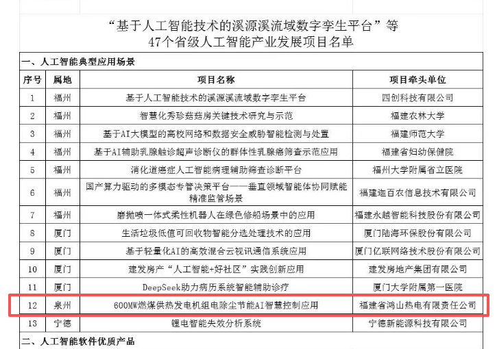 近日,福建省工业和信息化厅发布《关于公布“基于人工智能技术的溪源溪流域数字孪生平台”等47个省级人工智能产业发展项目的通知》,公司自主申报的“600MW燃煤供热发电机组电除尘节能AI智慧控制应用”项目成功入选省级人工智能典型应用场景,标志着公司在人工智能与电力生产融合创新领域取得重要进展。